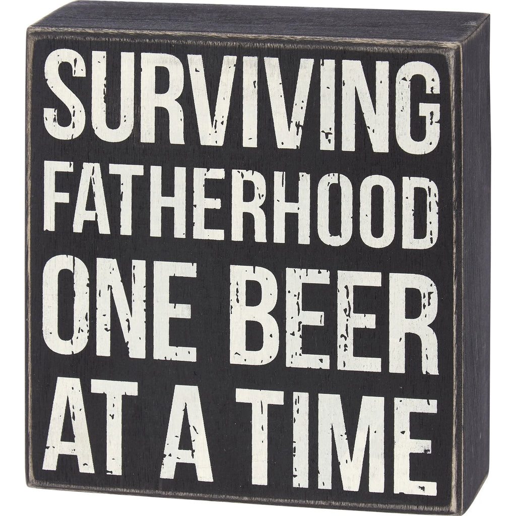 A classic black and white wooden box sign from Primitives by Kathy's Father's Day Collection, displaying a distressed "Surviving Fatherhood One Beer At A Time" sentiment. Our Surviving Fatherhood One Beer box sign is easy to hang or can free-stand alone.