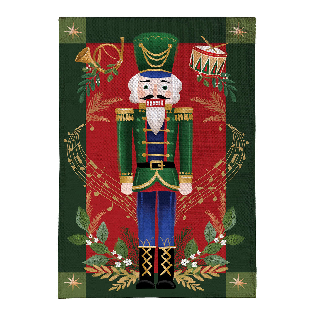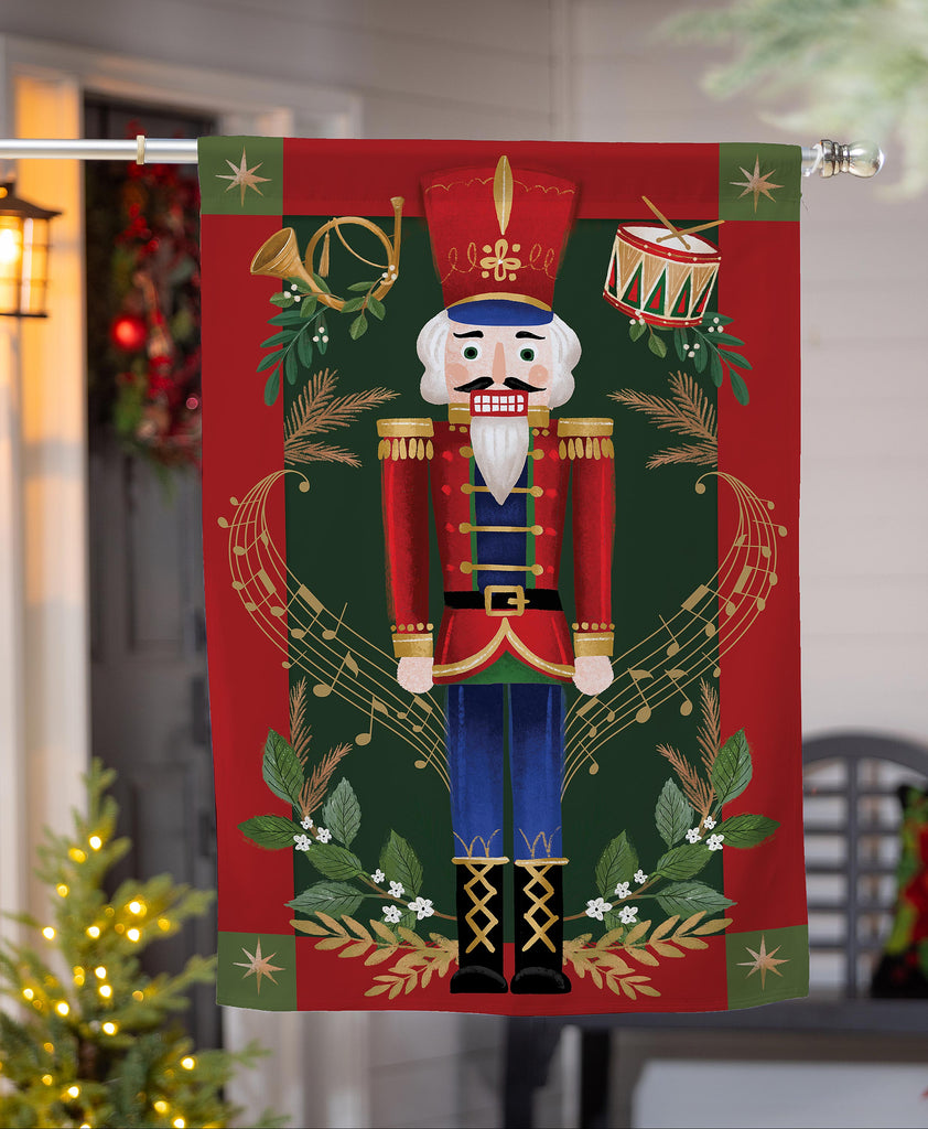 This reversible burlap house flag features two stately Nutcrackers, capturing a timeless sense of nostalgia and tradition. Crafted for outdoor display, each side presents a unique design, enhancing your home's festive charm from every angle. Its durable burlap material combines classic texture with lasting quality, making it an expert choice for seasonal decoration.