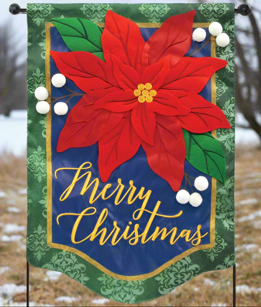 Enhance your holiday décor with the Poinsettia Double Applique Garden Flag, showcasing a striking 3D poinsettia design that adds depth and texture to your outdoor space. The “Merry Christmas” message at the base delivers a festive greeting, making this flag an elegant and enduring addition to your seasonal decorations. Crafted for lasting appeal, it brings a classic holiday spirit to any garden or porch.
