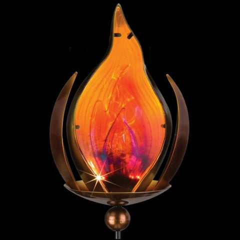 Transform your garden into a fiery spectacle with the Bronze Blaze Solar Stake! By day, its vibrant red and orange glass with shiny metallic backing captures sunlight, mimicking a lively flame. When night falls, this flame-shaped beauty lights up with a flickering glow, casting a warm, magical ambiance for 6 to 8 hours. The sturdy two-prong fork keeps it firmly in place, so your garden’s got its own little campfire—no matches needed!
