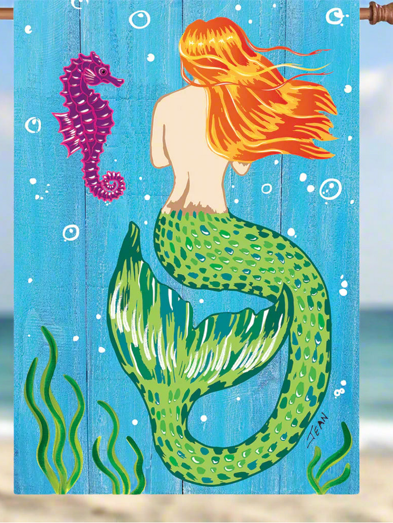 Bring a touch of seaside whimsy to your home with the Mermaid & Seahorse Polyester House Flag. Featuring a beautifully detailed mermaid with flowing hair alongside a graceful seahorse, this flag offers enchanting coastal charm. Made from durable polyester, it is crafted to withstand everyday outdoor conditions while maintaining vibrant colors and design integrity.