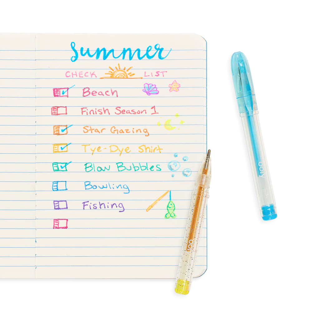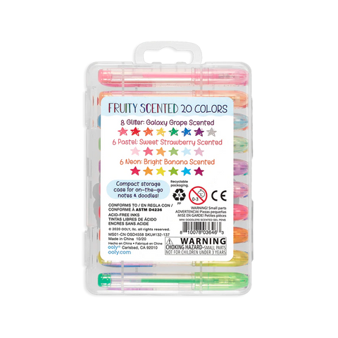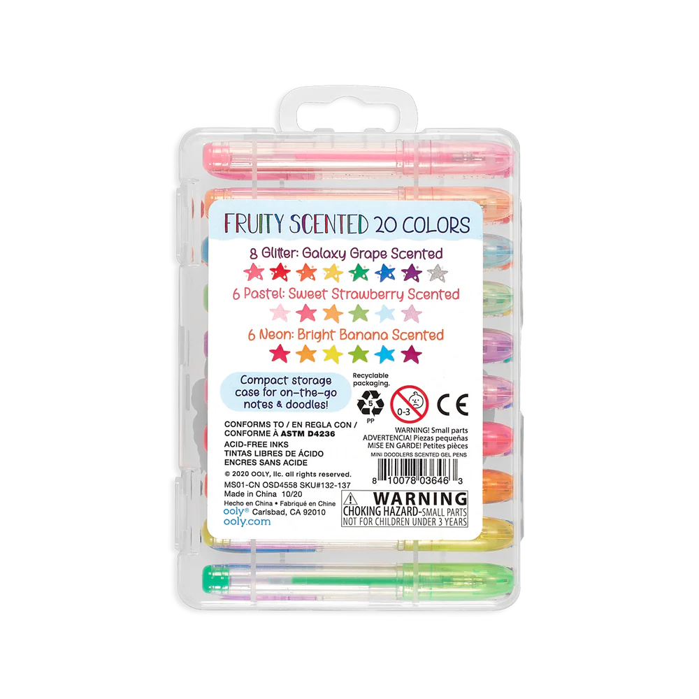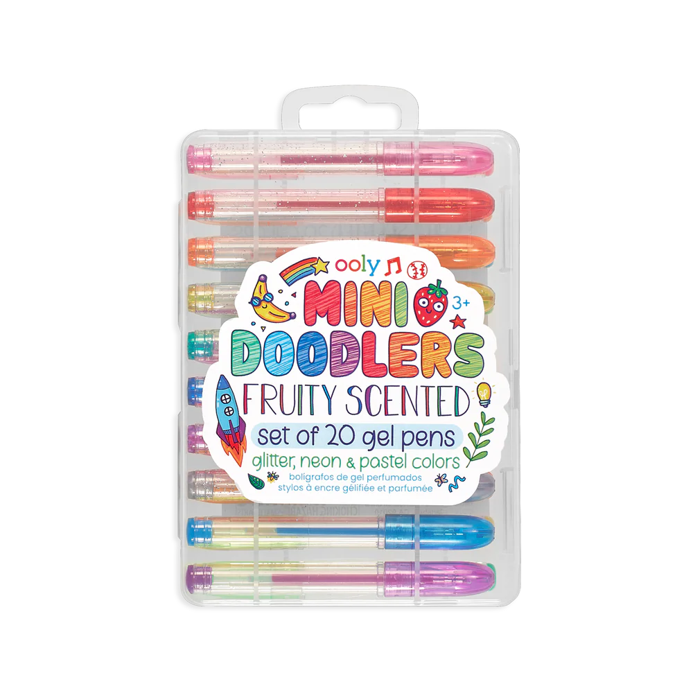 Mini Doodlers Fruity Gel Pens offer 20 vibrant colors, including glitter, neon, and pastel shades, for endless creative fun. Each smooth-writing pen is scented with delightful fruity aromas like grape, orange, and pineapple, making every doodle and note extra special. Perfect for ages 3 and up, this colorful set comes in a reusable plastic case for easy organization and portability. Brighten your writing and artwork with a burst of color and scent!